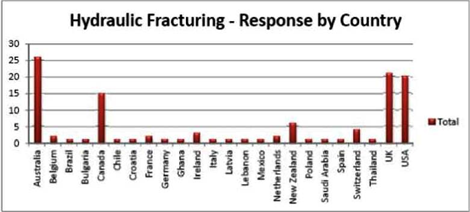 FRACTURAREA HIDRAULICA, subiect larg dezbatut in Romania in cercurile de specialisti, organizatii de mediu si spatiul media, a constituit subiectul unui sondajului online efectuat de IAH. Rezultatele acestui sondaj au fost publicate in News &Information, din Decembrie 2013. Graficul asociat acestui articol prezinta numarul de specialisti din fiecare tara care au raspuns invitatiei IAH de a impartasi opiniile lor in legatura cu intrebarile sondajului.